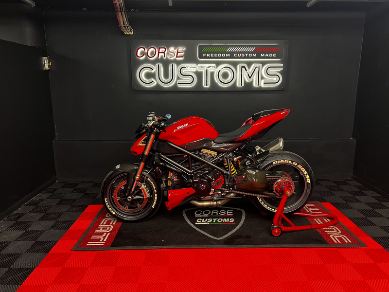 This Ducati 1098 represents the perfect fusion of raw Italian performance and refined custom craftsmanship. Finished in iconic Ducati red and presented in the Corse Customs studio, this machine commands attention from every angle.