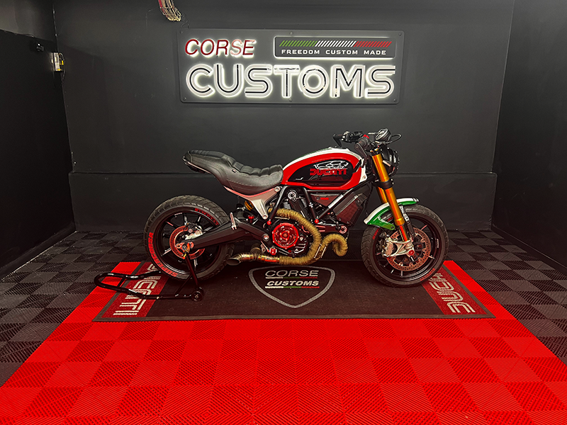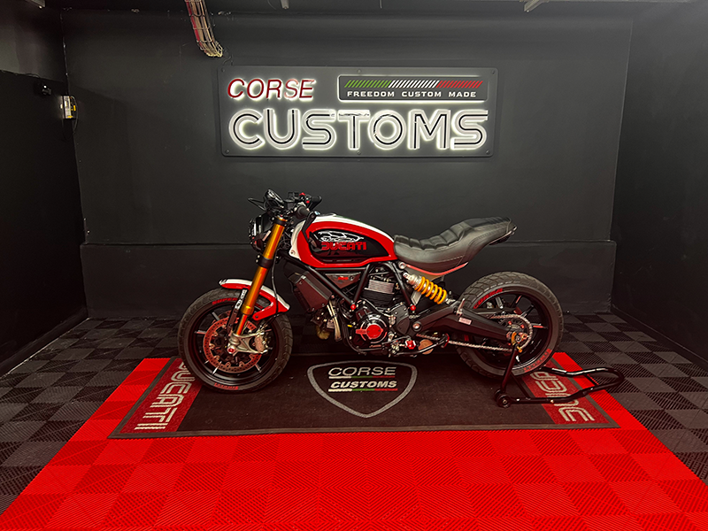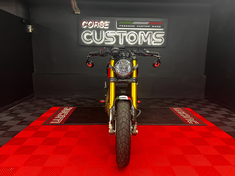 Finished in striking custom paintwork and complemented by a bespoke seat, upgraded suspension and braking components, and a custom exhaust system, this Scrambler stands apart from standard models. The build maintains the Scrambler’s iconic character while enhancing its stance, sound, and overall presence.